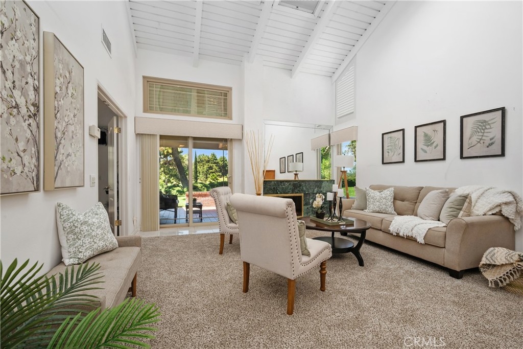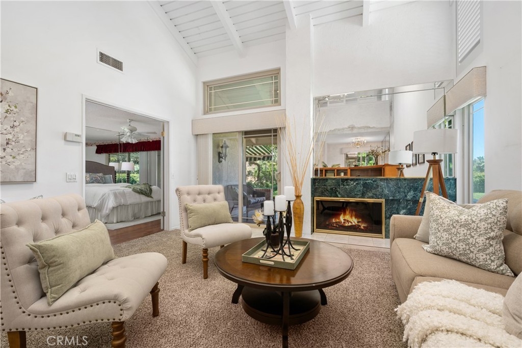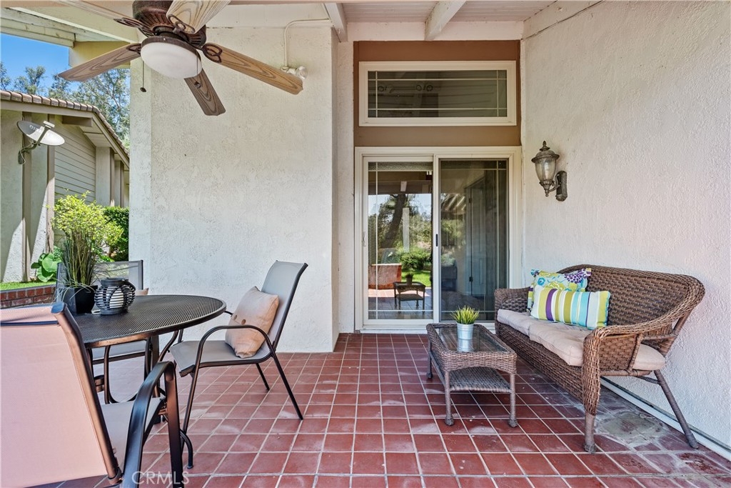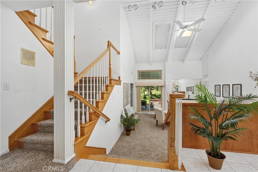 Welcome to Canyon Crest Villas—a tranquil neighborhood situated adjacent to the Canyon Crest Country Club golf course. This residence sits next to the 3rd tee and features a rear patio that provides stunning views of both the golf course and surrounding hills. The home’s inviting tri-level layout creates an open atmosphere, enhanced by vaulted ceilings and skylights that allow natural light to fill the space. Entry is on the middle level, where you will find the dining room, kitchen, laundry area, and garage access. Ceramic tile flooring extends throughout these main living areas, while new carpeting has been installed in the remaining rooms. The kitchen includes a comfortable eating area and ample counter space, ideal for preparing gourmet meals. A sunken living room below the entry terrace features a built-in storage and entertainment unit, multiple seating options, and a gas fireplace with a marble surround. Sliding doors provide easy access to the back patio. Adjacent to the living room, the primary bedroom suite boasts hardwood floors, a sliding door to the patio with picturesque golf course views. The primary bath space features a dual sink vanity, a spacious shower, and multiple closets—including a unique under-stair storage space. Upstairs are two additional bedrooms, one equipped with built-in office cabinetry overlooking the living area. The serene setting along the golf course offers the perfect environment to relax and enjoy the outdoors from the back patio. Residents benefit from exceptional community amenities, including an HOA clubhouse, pool, and spa—offering a resort-style experience just minutes from shopping, UCR, and all the attractions Riverside has to offer.