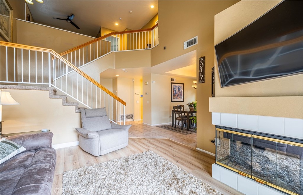 This beautiful condominium offers an open and airy layout. The first floor features a spacious living room with a cozy fireplace and soaring catherdral ceilings, seamlessly flowing into the kitchen and dining area perfect for entertaining and everyday living. On the second floor you'll find two generous bedrooms, two full bathrooms, providing comfort and privacy. Additional loft area boasts versatility for use as a home office, guest space or lounge, making this home both functional and inviting. End unit, with an attached two car garage. Enjoy the privacy of your own patio, perfect for outdoor relaxation. Located near shopping centers, schools, freeways, and the MetroLink, making it ideal for commuters and anyone else. Don't miss out on making this your next home.