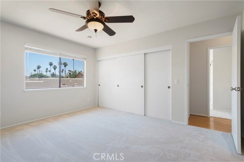 Single Story condo in the beautiful Palm Terrace complex, located by Poly High School. New carpet and paint. The living/family room is spacious with a wet bar, large brick fireplace and a sliding glass door to a side patio. The open floor plan has a large dining area. The master bedroom is large with lots of closet space. The master bathroom has a jetted tub big enough for 2. Complemented by the grey marble tile and upgraded cabinets. The above counter glass sink is a nice touch. Fans throughout. One of the bedrooms has a wall to wall bookcase. Linen storage in the hall. This home is private on a small cul de sac and has a 2 car garage.