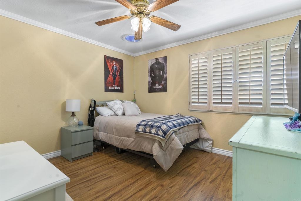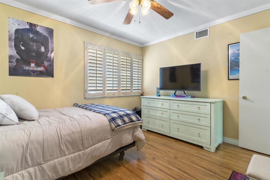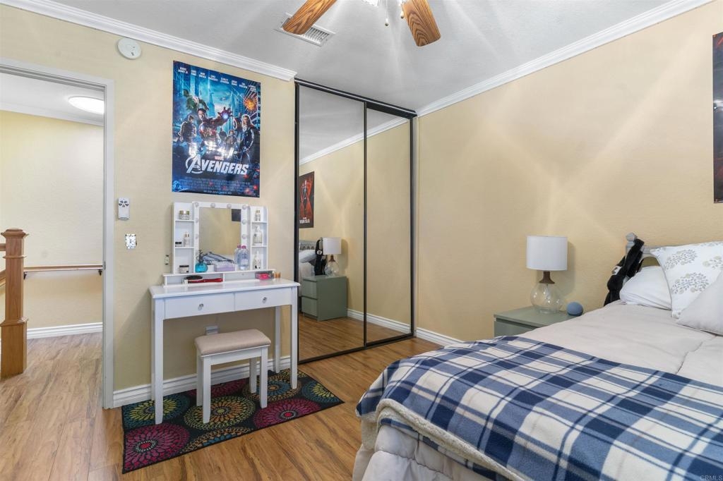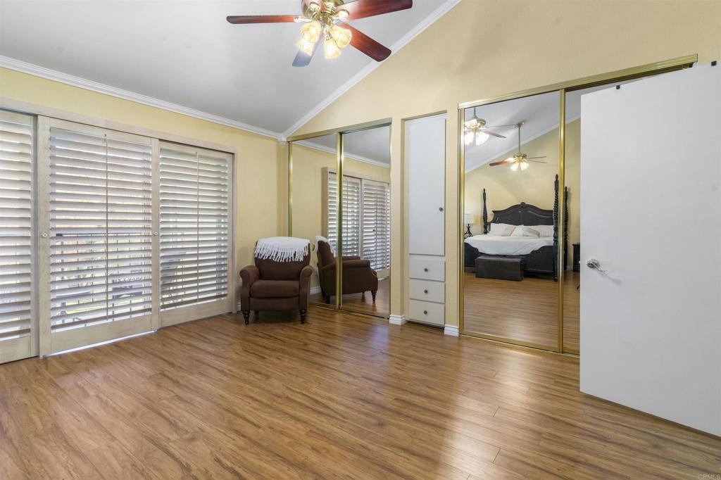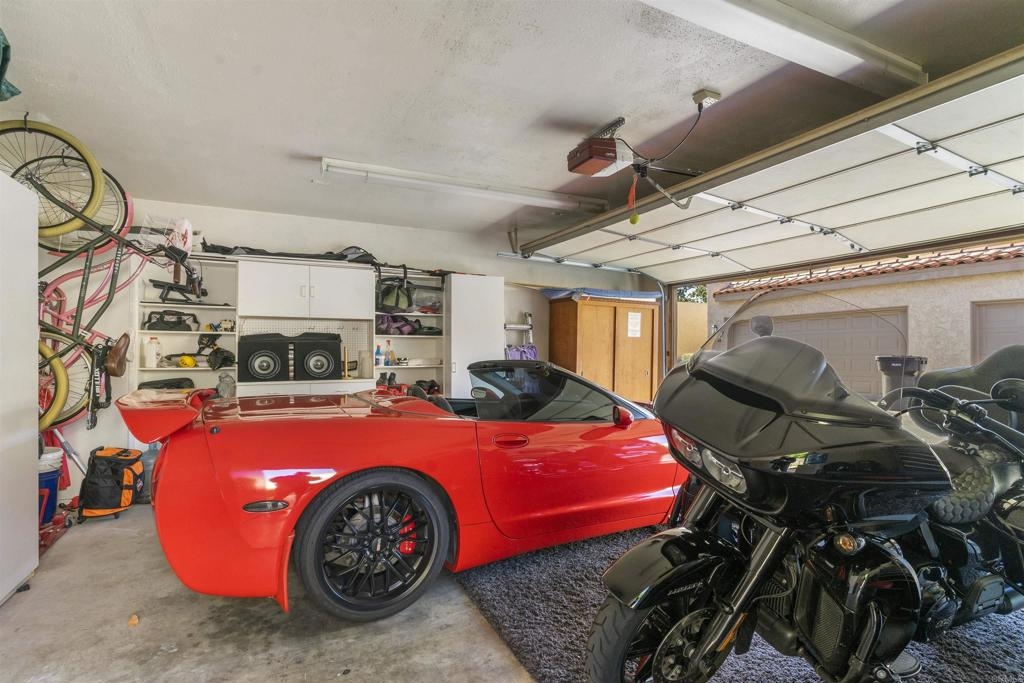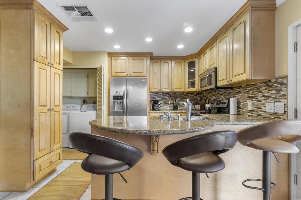 Beautifully upgraded townhome in the highly sought after Park Granada gated community. Set in an exquisitely maintained community park with 3 pools and 2 spa areas, this 2,000 square foot home has a remodeled kitchen with upgraded cabinets, granite counters and stainless steel appliances. Tiled floors throughout the kitchen and family room that features a granite covered buffet and fireplace. French doors that lead out to one of two patios with a retractable awning, and spanish pavers. The living room/dining room has a dry bar, 1/2 bath, plantation shutters, mirrored wall, custom entry door and, its own patio with a view of the greenbelt/park. Upstairs, you'll find the spacious master bedroom that features a vaulted ceiling, plantations shutters and its own balcony with view. The master bath features marble throughout with double sinks. Two more guest bedrooms with mirrored closet doors and plantation shutters, as well as a second full bath. A drop down ladder leads to huge attic space for storage. Manufactured wood flooring throughout. Detached 2 car garage. Secure gated community.