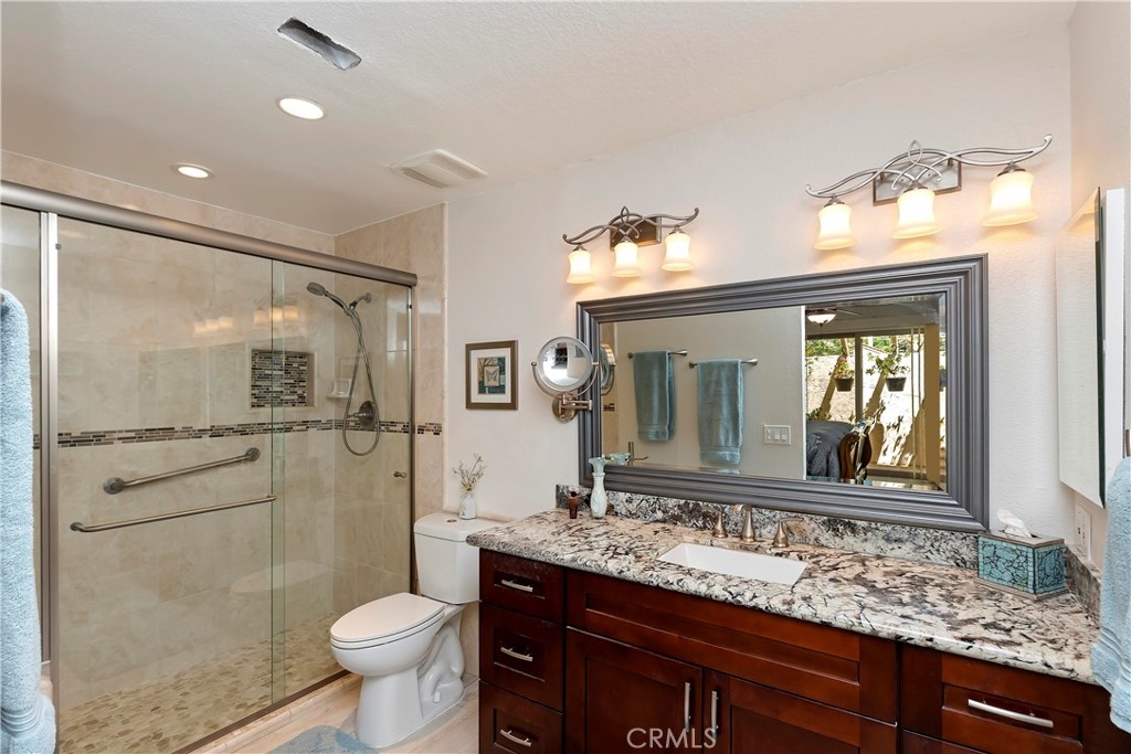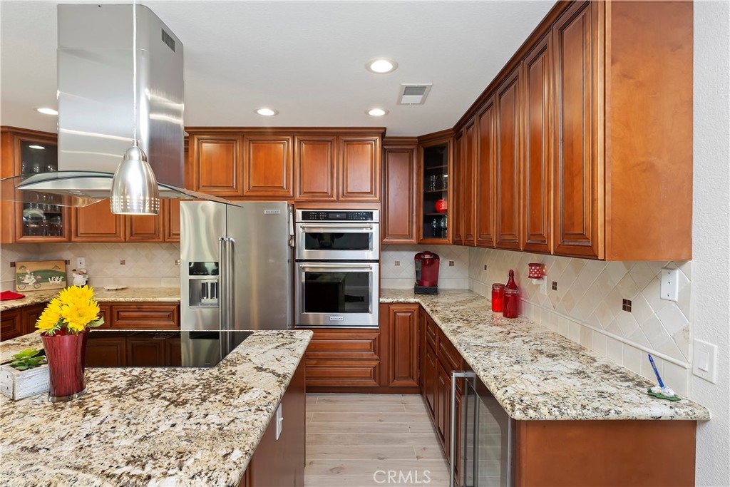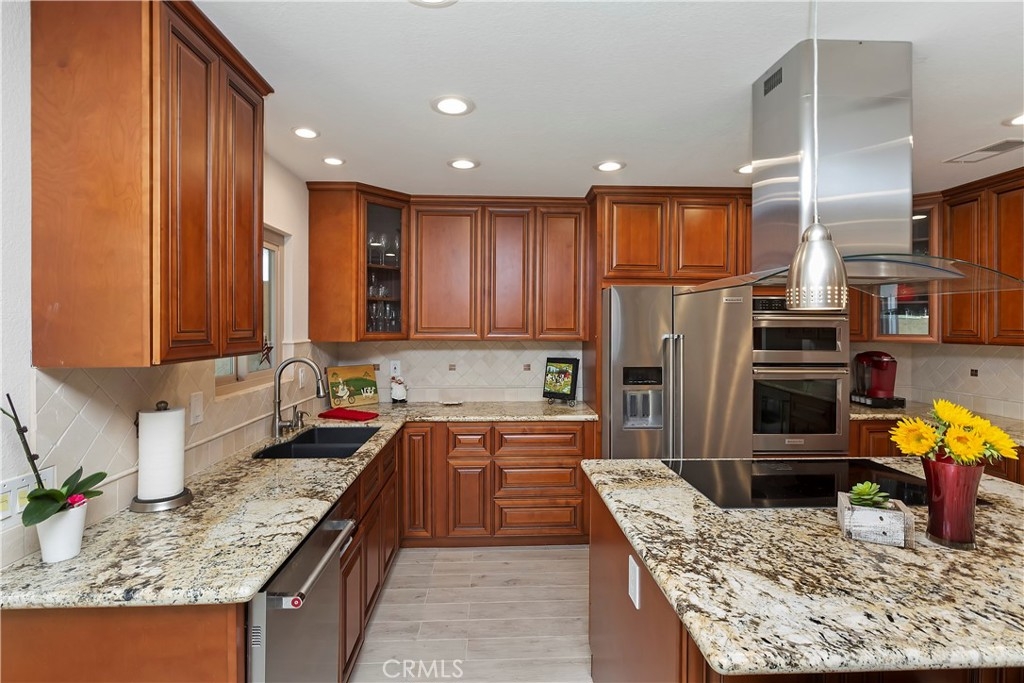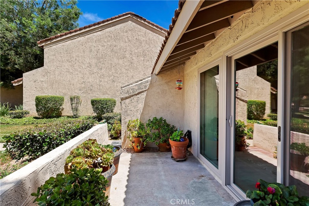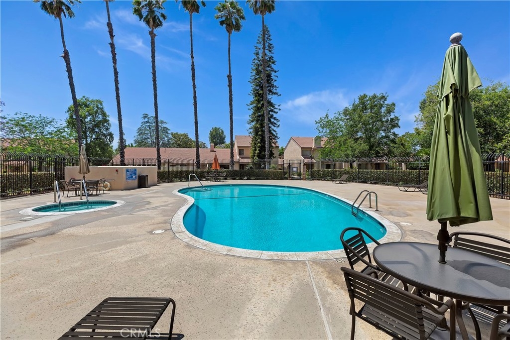 Welcome to this beautifully remodeled condo located in a gated community in a desired area. This rare single story, end unit offers an open floor plan with a large family room with cathedral ceilings, new dual pane windows and sliders that offer plenty of natural light and park-like views out the front courtyard. The kitchen has been fully remodeled with self closing cabinet doors, self closing drawers, center island with cooktop, wine cooler, stainless steel hood vent and refrigerator, granite countertops, stone backsplash, built-in pantry, conventional oven, conventional and convection microwave, and plenty of storage space. Off the kitchen is space for a dining area and a sliding glass door with access to the back patio. All bedrooms are good size with closet space. The primary bedroom has a large closet and its own private patio. Primary bathroom, along with en suite, has been remodeled with a walk in shower and granite counter tops. Throughout the home is ceramic tile flooring, individual laundry room located inside the unit for convenience, ceiling fans, recessed lighting, and offers 3 attached patios. There is a detached garage located nearby. This community is well maintained by the HOA and offers 3 pools, 2 spas, a picnic area, and landscape all throughout. Come see this home, it will not last. **Formal dining room can be turned into a third bedroom**