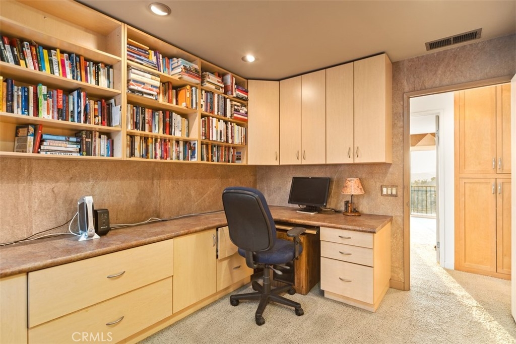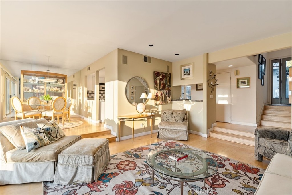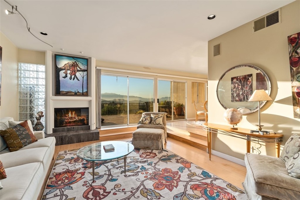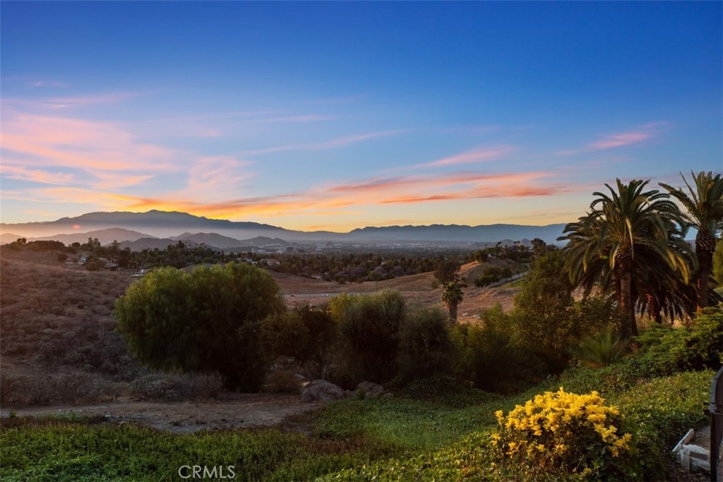 Panoramic vistas from this condominium nestled on top of Sunset Ridge in Riverside’s Canyon Crest neighborhood. Built in 1972, the sought after private Sunset Ridge community is a gated enclave of just 60 residences with detached 2 car garages, interior courtyards, and unbelievable views of the city lights, San Gabriel Mountains, including Mt. Baldy, Mount Rubidoux and downtown Riverside. The wrought iron entry gate leads to the interior courtyard with tile flooring and slate accents and towering queen palms. The modern glass entry door opens to the large living room with 9 foot ceilings, wood floors, and gas fireplace. The formal dining room sits just above the living room the the two areas are connected by 14 feet (8ft, 6ft) of sliding glass doors with dramatic views below. The U-shaped kitchen opens to the separate family room with lots of counter space, cabinets for storage and double ovens with a gas cooktop. The family room has dual French doors which lead out to the front courtyard and provides for both privacy and abundant natural light. Up the stairs the primary suite is the highlight with over 315 square feet of living space, a walk-in closet, dual vanity and walk-in shower. Two sets of dual paned sliding doors, together measuring 14 feet, provide beautiful views to enjoy morning coffee or an evening glass of wine on the balcony. There are two additional guest bedrooms (14ft x 11ft and 13.5 x 10ft +/-) with mirrored closets, ceiling fan and built-ins. The upstairs guest bathroom has a tiled shower in tub and tiled vanity. The 500+/1 square foot back patio is the quintessential space to entertain friends and family or just have a quiet dinner and enjoy the unparalleled Riverside views.
