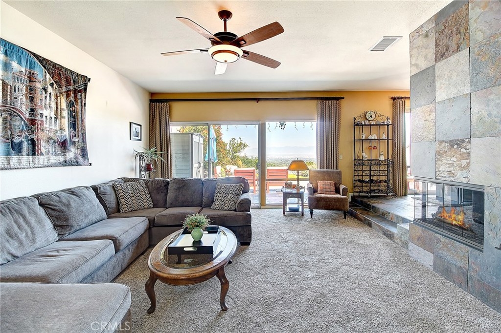 Located in the exclusive Sunset Ridge community, this hillside home has some of the city’s most spectacular views of the mountains, city lights and surrounding hills. The main floor features the living room with a cozy corner fireplace and sliding glass door with access to the large outdoor patio with slate flooring that is perfect for a BBQ, entertaining and taking in that view. Adjacent to the living room is the dining room with a wall of windows showing off those incredible views. The kitchen has built-in cabinets with pull out drawers, granite countertops, recessed lighting, a breakfast counter bar, subzero refrigerator and newer appliances and opens to the office/den area and inside laundry room. A sliding glass door from the office/den exits to a covered courtyard patio for private entertaining. Upstairs is the master bedroom and spacious master bathroom featuring dual vanity sinks and dual closets as well as an additional bedroom and full bathroom. Other features of this home are beautiful slate tile and wood laminate flooring, newer A/C system, ½ bathroom on the main floor, avocado and fruit trees on the hillside below the backyard and a two car garage. This private home is in a gated community which features 2 pools, spa, tennis court, water paid by the HOA and plenty of guest parking throughout the community. This incredible home will be someone's dream come true!