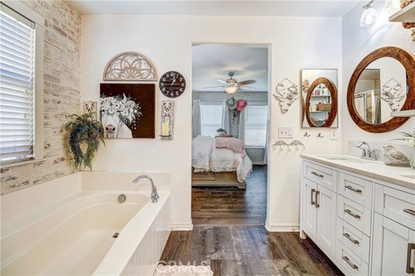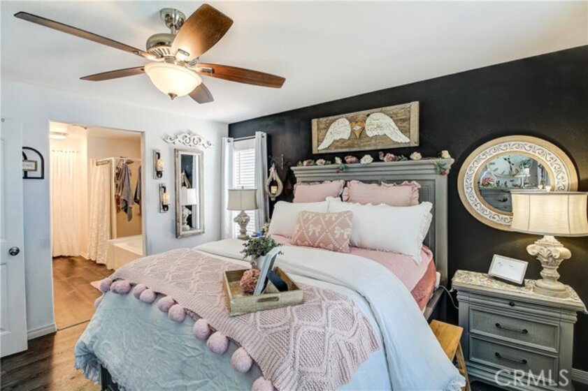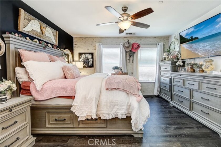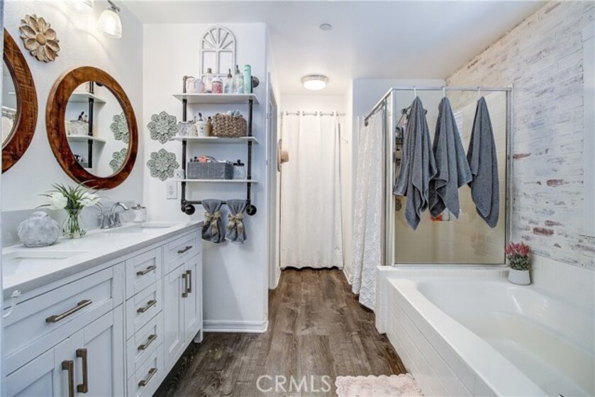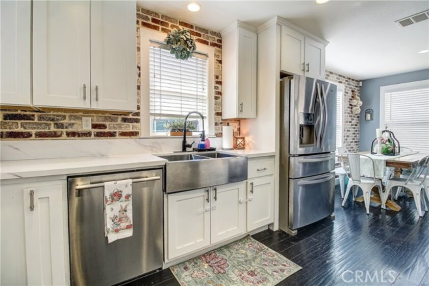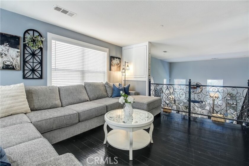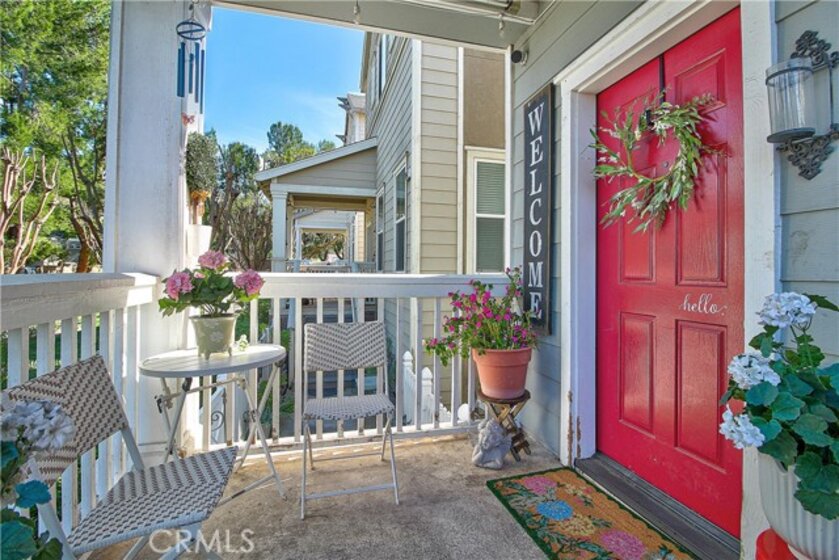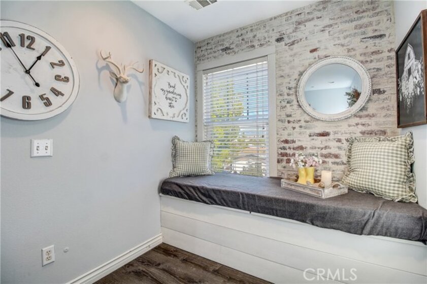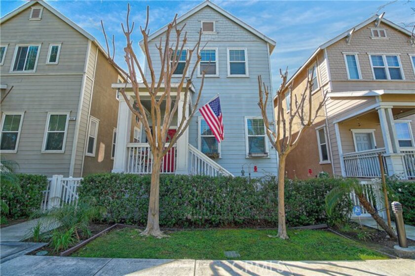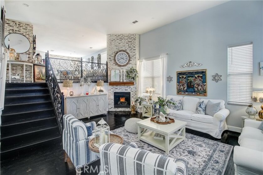 Adorable Cape Cod-style tri-level townhouse tucked away at the back of a private, beautifully maintained community with only 22 units - and completely detached with no shared walls! Offering 1,815 sq ft with 3 bedrooms and 2.5 bathrooms, this home feels like walking into a model. Enter through the front door into a stunning living room featuring rich bamboo flooring and a gorgeous floor-to-ceiling fireplace with a custom German schmear finish. From the living room, you can see up to the family room through an elegant wrought-iron railing, creating an open and inviting architectural design. The main living level offers a spacious family room, dining area, and a beautifully appointed kitchen with white cabinetry extending to the ceiling, stainless steel appliances, and charming German schmear finish brick accents carried throughout the home. A convenient half bath completes this level. Upstairs, the primary suite features an attached bathroom with dual sinks, a private water closet, a separate soaking tub and shower, and a walk-in closet. Two additional bedrooms, a full bathroom, and an upstairs laundry room provide both comfort and functionality. The lower level offers a large storage area closet approximately 4' x 22' and direct access to the attached two-car garage. Enjoy outdoor living in the small gated side courtyard, complete with a cozy firepit — perfect for relaxing or entertaining. The community is nicely landscaped with mature trees and amenities, including a basketball court, sand volleyball court, and picnic tables. Ideally located near the 91 and 15 freeways, shopping, and dining. An exceptional opportunity to own a refined, turnkey residence where design, comfort, and location converge.