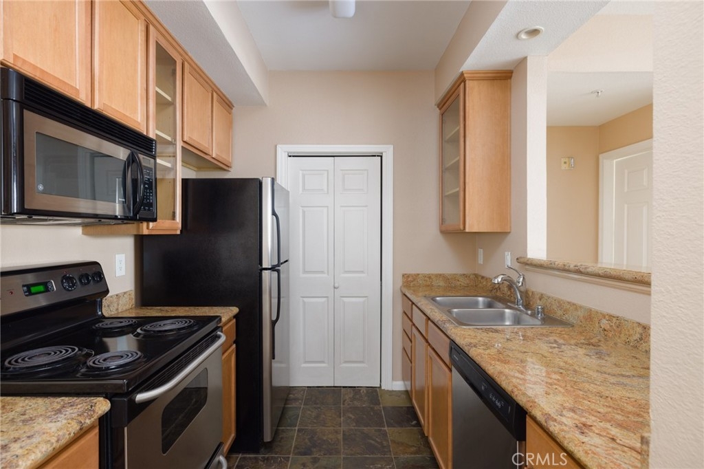 Welcome to Sonata at Canyon Crest. This charming ground level condo features two bedrooms and two bathrooms, open concept living, dining, kitchen space and more! From the entryway, step into the living room with sliding door access to your private covered patio. The kitchen features warm wood cabinetry, solid surface counters, stainless steel appliances, a breakfast bar, and attached dining area; in unit laundry is an added bonus. The master bedroom is filled with natural light, a walk in closet, and attached ensuite featuring a separate vanity area with warm wood cabinetry and granite top, and shower. The second bedroom also features a walk in closet, separate vanity area with warm wood cabinetry, granite countertop and tub/shower combo. The community includes a pool and spa, assigned covered parking, automated gate access, club house, exercise room, sauna and tennis courts. Water and trash are included in the HOA fee. Located close to freeway access, shopping, dining, local attractions, universities and more; top it all off with breathtaking arroyo views!