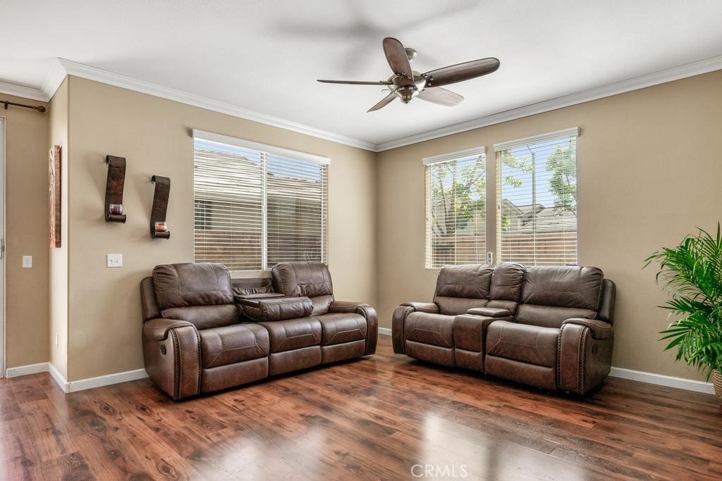 This beautiful home is located in the lovely Riverwalk Coronado Village Community near La Sierra University. Great corner lot location. Wood laminate flooring was installed downstairs in 2020. This home has four bedrooms, three bathrooms, a living room, and a family room. The kitchen is open with an island, granite countertops, pantry as well as built-in appliances. The dining room has a sliding glass door that opens to the large side and back-yard concrete patio area. Great for entertaining. Other features are crown molding and recessed lighting. All bedrooms have carpet and are located upstairs. The master bedroom features a large oval bathtub with a separate shower. There are dual vanities in both upstairs bathrooms. The upstairs laundry room is a plus with storage. The grounds are lovely. It includes the association pool, lots of greenery as well as a pond. Come and see for yourself.