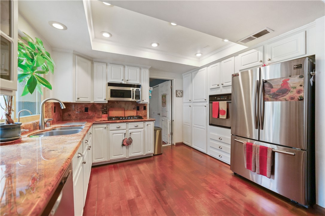 Welcome to this beautifully designed tri-level condo in the desirable Canyon Crest community, offering 1,945 sq ft of stylish living space with 3 bedrooms and 2.5 bathrooms. This home’s inviting layout is enhanced by vaulted ceilings and skylights that flood the space with natural light, creating an airy, open atmosphere throughout. Entry is on the middle level, where you’ll find the kitchen, dining area, laundry, and direct access to the attached garage. Just down a short set of stairs, a sunken living room provides a cozy yet spacious living area featuring multiple seating options, and a gas fireplace. Sliding glass doors open to a private back patio with breathtaking golf course views—perfect for relaxing or entertaining. Adjacent to the living room, the private primary suite boasts hardwood floors and a full en-suite bath. Wake up to serene views and enjoy peaceful evenings in this quiet, scenic setting. Upstairs, two well-sized bedrooms and a full bathroom complete the top level, offering comfort and flexibility for guests, family, or a home office. Residents enjoy access to outstanding HOA amenities, including a clubhouse, sparkling pool, and spa—providing a resort-style experience just minutes from UC Riverside, Canyon Crest Towne Centre, shopping, dining, and local attractions.